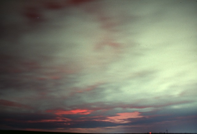 Nachdem Ulrich und ich mal wieder ca. 300KM gefahren sind und außer Wolken nichts gesehen haben, verabschiedeten wir uns gegen 01:15MESZ. Unterwegs klingelte dann das Handy. Ulrich war dran. Die Show würde wieder losgehen. Habe dann erst einmal, nachdem ich von der Autobahn runter war, angehalten. Natürlich mitten in einer riesigen Pfütze. Na danke, aber was tut man nicht alles für sein Hobby. Habe allerdings nicht viel gesehen. Wollte dann doch erst einmal nach Hause. Am Haus fuhr ich allerdings vorbei, ab ins Feld, Richtung Norden. Angehalten und schon wieder im Matsch gestanden. Macht nichts. Habe nur rausgeschaut und da sah ich den riesigen, hellroten Fleck. Also Digiknipse raus, auf dem Auto aufgelegt und abgedrückt. Leider ist die Aufnahme verwackelt. Dachte die Aktivität würde noch ein wenig anhalten und habe deswegen erst einmal komplett aufgebaut. D.h. eigentlich nur die Canon mit EF1.8/28mm und am gleichen Stativ die Digiknipse. Die Aktivität hat noch recht lange angehalten, nur meine Wolkenlücken haben sich mit der Zeit verzogen. Man wäre das eine Show gewesen, hatten wir klaren Himmel gehabt.