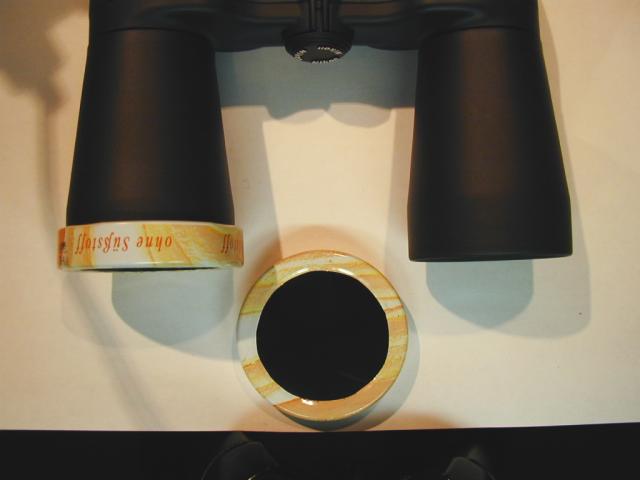 Mittlerweile habe ich für mein neues Fernglas und für den 60mm Kaufhausrefraktor einen solchen Sonnenfilter gebaut. Auf dem rechten Bild der linke Filter ist für den Refraktor und der rechte ist für den TAL-Sucher. Als nächtes werde ich mal die neue Baader Sonnenfilterfolie ausprobieren. Denn mein TAL benötigt auch noch einen Sonnenfilter. Nur mit so einem großem Marmeladenglas, wo der Deckel auf das TAL passen könnte, habe ich noch ein kleines Problem. :-)