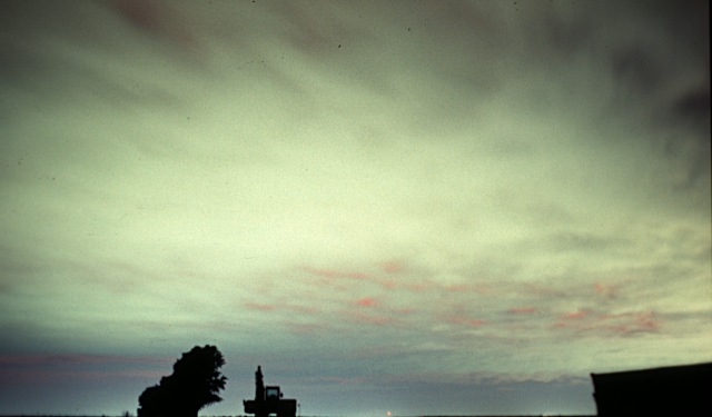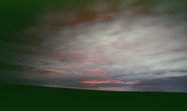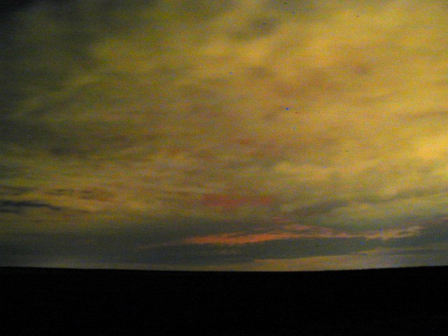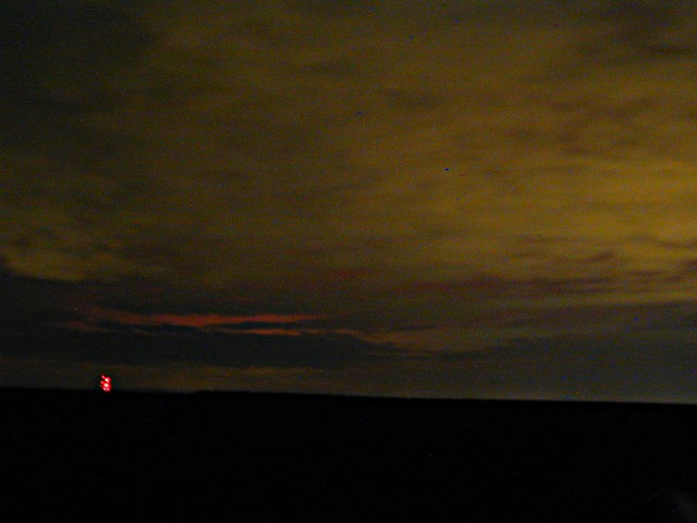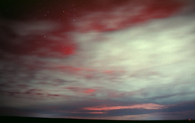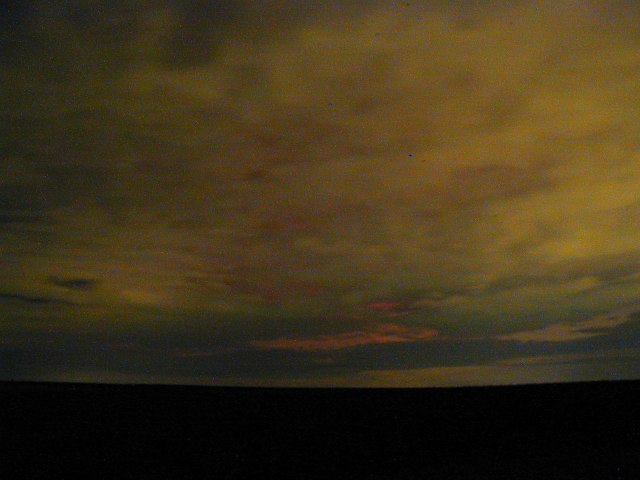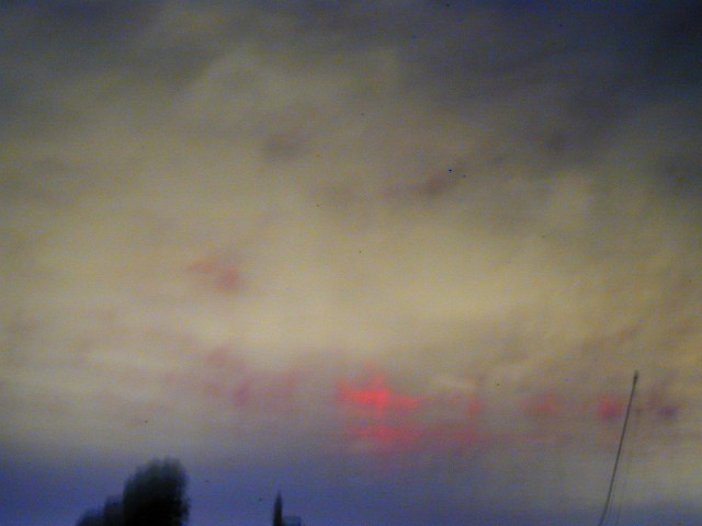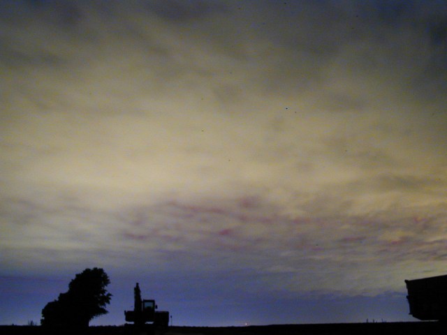 Nachdem Ulrich und ich mal wieder ca. 300KM gefahren sind und außer Wolken nichts gesehen haben, verabschiedeten wir uns gegen 01:15MESZ. Unterwegs klingelte dann das Handy. Ulrich war dran. Die Show würde wieder losgehen. Habe dann erst einmal, nachdem ich von der Autobahn runter war, angehalten. Natürlich mitten in einer riesigen Pfütze. Na danke, aber was tut man nicht alles für sein Hobby. Habe allerdings nicht viel gesehen. Wollte dann doch erst einmal nach Hause. Am Haus fuhr ich allerdings vorbei, ab ins Feld, Richtung Norden. Angehalten und schon wieder im Matsch gestanden. Macht nichts. Habe nur rausgeschaut und da sah ich den riesigen, hellroten Fleck. Also Digiknipse raus, auf dem Auto aufgelegt und abgedrückt. Leider ist die Aufnahme verwackelt. Dachte die Aktivität würde noch ein wenig anhalten und habe deswegen erst einmal komplett aufgebaut. D.h. eigentlich nur die Canon mit EF1.8/28mm und am gleichen Stativ die Digiknipse. Die Aktivität hat noch recht lange angehalten, nur meine Wolkenlücken haben sich mit der Zeit verzogen. Man wäre das eine Show gewesen, hatten wir klaren Himmel gehabt.